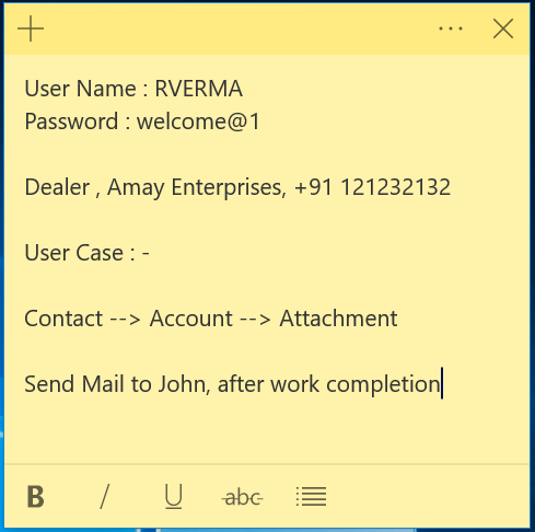 So, the idea is to make something in siebel, that can be used as a writing pad where we can write some details like Account Name, Password, Username, Frequently used Entities, Mobile number etc.